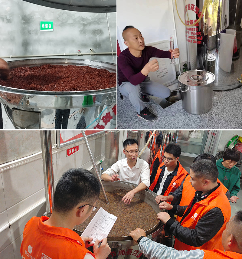長沙尋總采用高粱固態(tài)工藝,但出酒率只有35%。蔣老師上門指導(dǎo)后,發(fā)現(xiàn)兩個關(guān)鍵問題:一是發(fā)酵好的酒醅太濕,二是上甑方法不對導(dǎo)致高度酒少、低度酒多。經(jīng)過技術(shù)改進,出酒率提升到了58%,每100斤糧食多賺300多元!