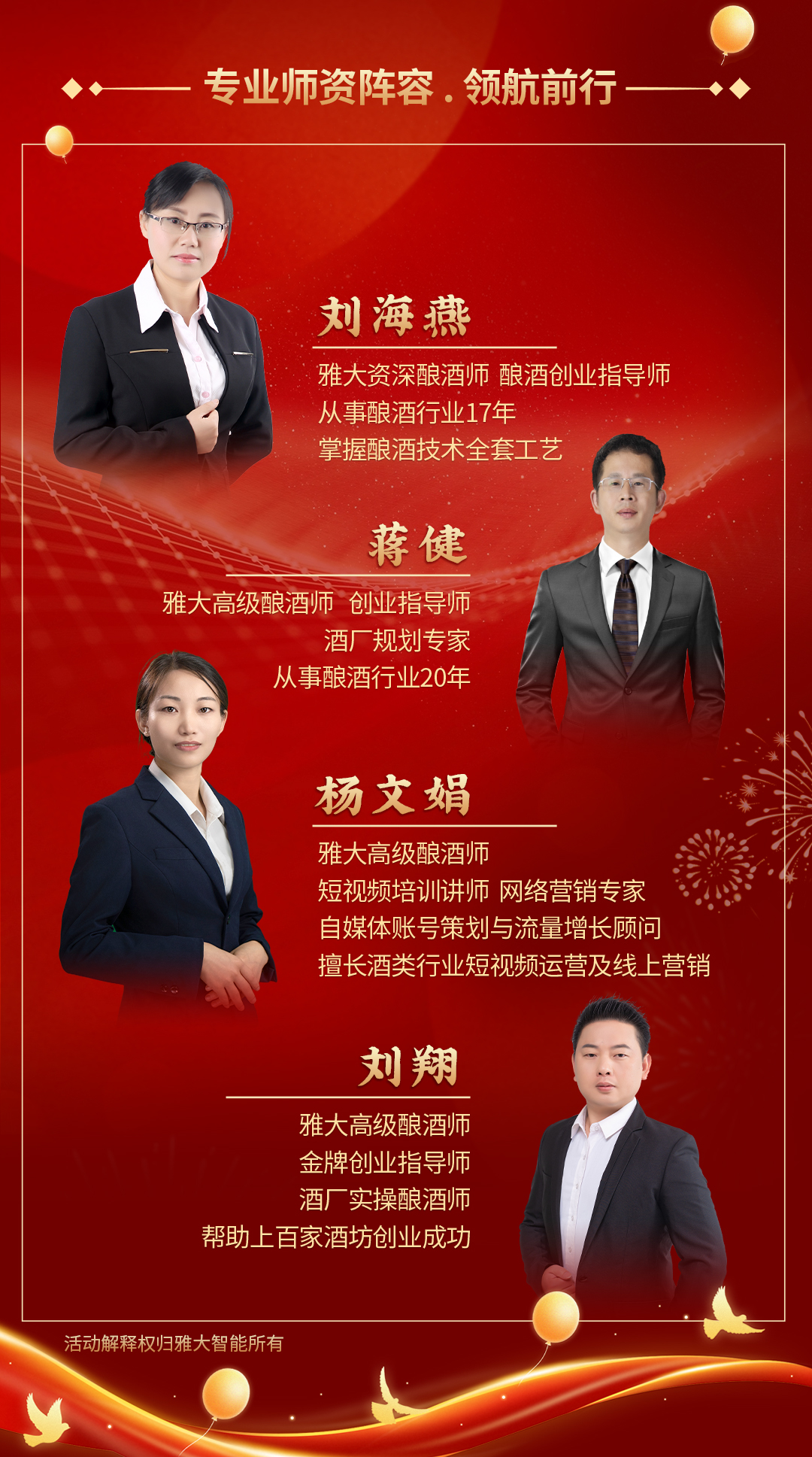技術(shù)學(xué)習(xí),名師至關(guān)重要。在釀酒這個(gè)需要深厚積淀的領(lǐng)域,“一級(jí)釀酒師”、“一級(jí)品酒師”等專業(yè)資格證書,絕非一紙空文,而是專業(yè)能力與深厚功力的背書!雅大導(dǎo)師團(tuán),正是兼具“持證上崗”與豐富實(shí)戰(zhàn)經(jīng)驗(yàn) 。