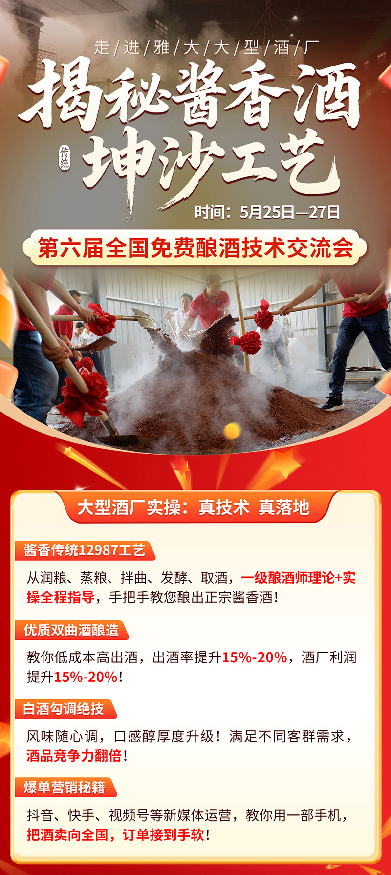 國(guó)匠級(jí)導(dǎo)師團(tuán)坐鎮(zhèn),3000斤醬香坤沙工藝現(xiàn)場(chǎng)實(shí)操,手把手教你熟練掌握醬酒工藝,提升酒坊競(jìng)爭(zhēng)力!