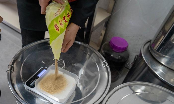 3、將一定比例的白糖溶解后倒入發(fā)酵桶里,按0.5%的比例加入雅大水果酒曲 ,攪拌均勻。
